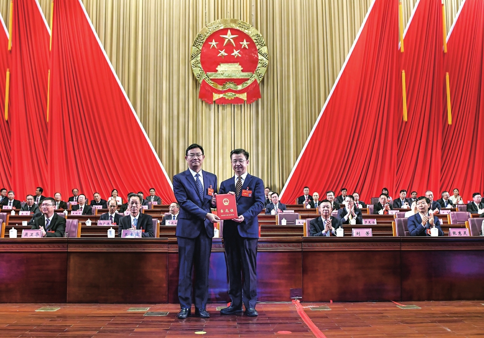 市委书记、市人大常委会主任庄悦群为王雄飞颁发当选证书。茂名日报社全媒体记者甘杨松闵灿摄