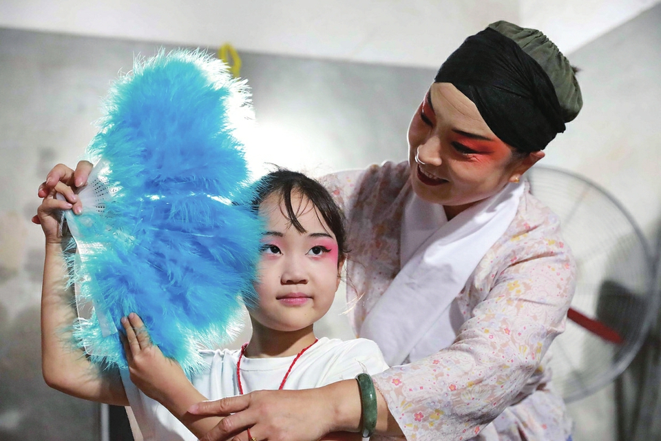 邢台市任泽区南路丝弦剧团团员在教小朋友表演。(图片由受访者提供)
