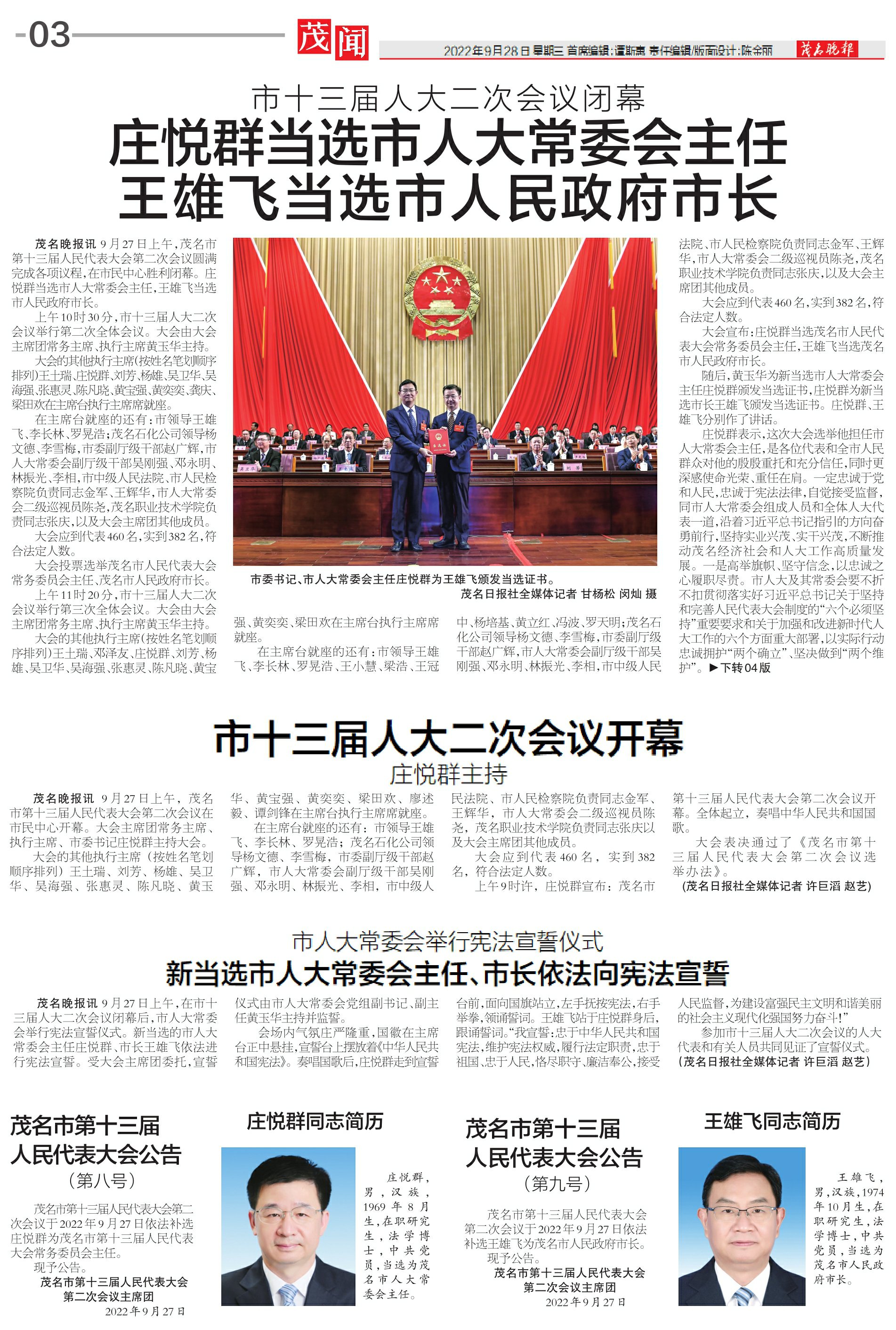 庄悦群当选市人大常委会主任王雄飞当选市人民政府市长