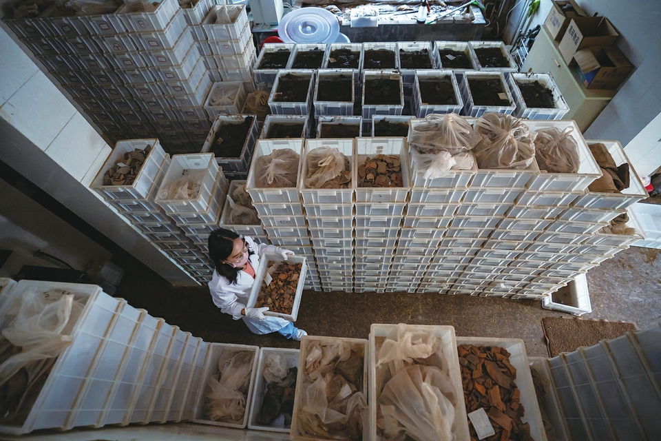 考古工作者在清理云南河泊所遗址 出 土 的 简 牍(2022年9月21日摄)。 新华社记者 江文耀摄