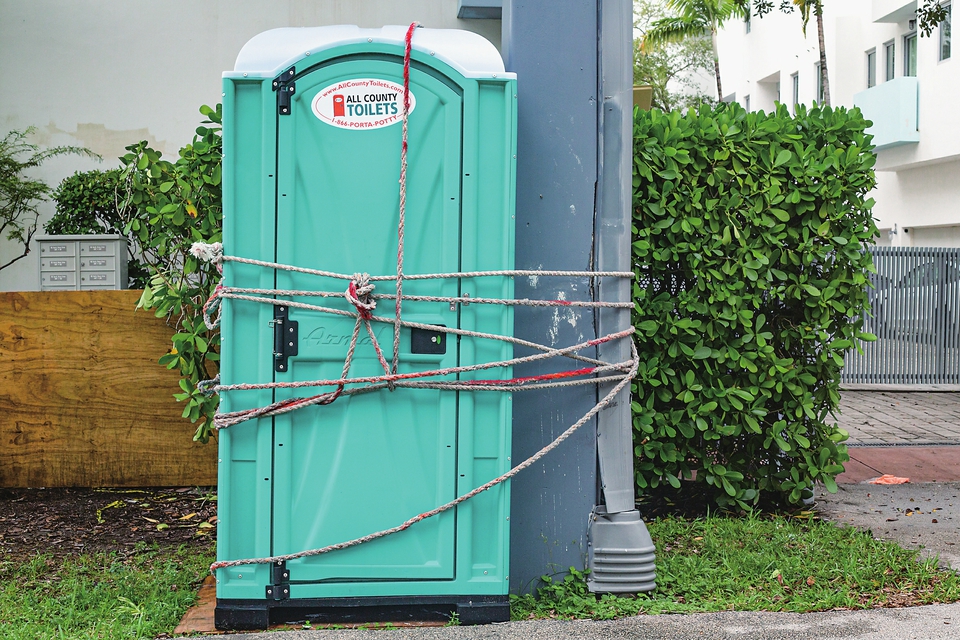 9月27日,在美国佛罗里达州迈阿密,一处移动厕所被固定到柱子上,防备即将到来的飓风。新华社发(莫妮卡摄)