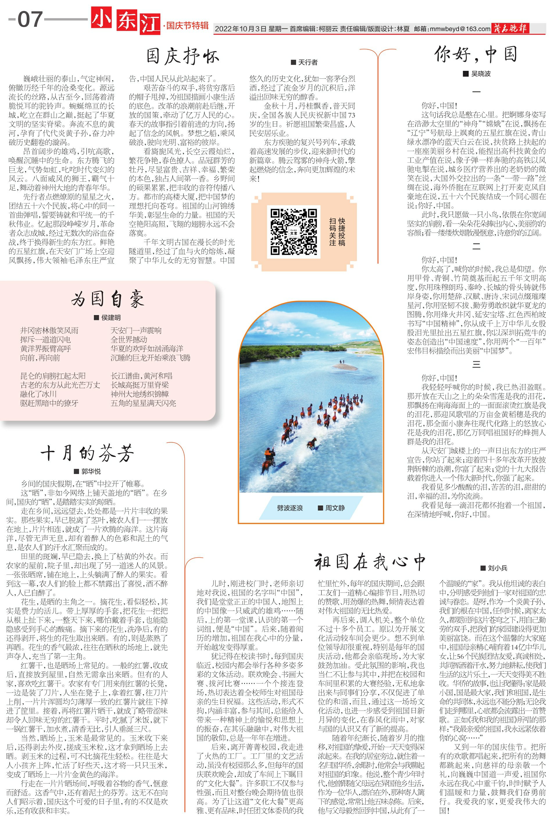 你好,中国!我轻轻呼喊你的时候,我已热泪盈眶。那开放在天山之上的朵朵雪莲是我的泪花,那飘扬在南海海面上的一面面滚烫红旗是我的泪花,那迎风歌唱的万亩金黄稻穗是我的泪花,那全面小康奔往现代化路上的怒放心花是我的泪花,那亿万同唱祖国好的蜂拥人群是我的泪花。