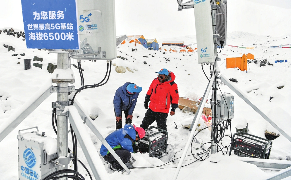 在海拔6500米的珠峰前进营地,中国移动工作人员在调试5G基站(2020年5月21日摄)。新华社记者晋美多吉摄