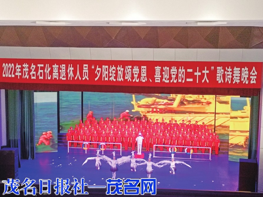 9月29日晚上,2022年茂名石化离退休人员“夕阳绽放颂党恩、喜迎党的二十大”歌诗舞晚会在茂名石化公司文化中心举行。他们用欢快的歌声、动人的舞蹈演绎最美夕阳红,展现了当代老年人风采,也为观众送上了一道丰盛的文化大餐。