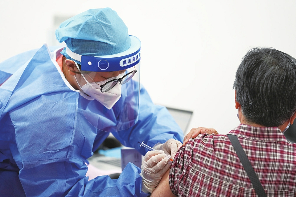 2022年7月13日,在北京市朝阳区奥运村街道一处新冠病毒疫苗接种点,医护人员为一名86岁的市民接种新冠病毒疫苗加强针。新华社记者鞠焕宗摄