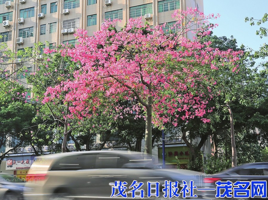 到了深秋,天已渐凉,茂名依然处处草木青绿,闹市街头可见鲜花盛开。近日,茂名晚报记者来到茂名市区新福二路、三路,发现这里的异木棉开花了,一树一树地绽放。有路过的居民告诉记者,今年的异木棉似乎花开更早,十月初就发现新福路的异木棉开花了。