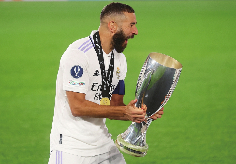 8月10日,本泽马庆祝夺得2022年欧洲超级杯足球赛冠军。新华社/路透