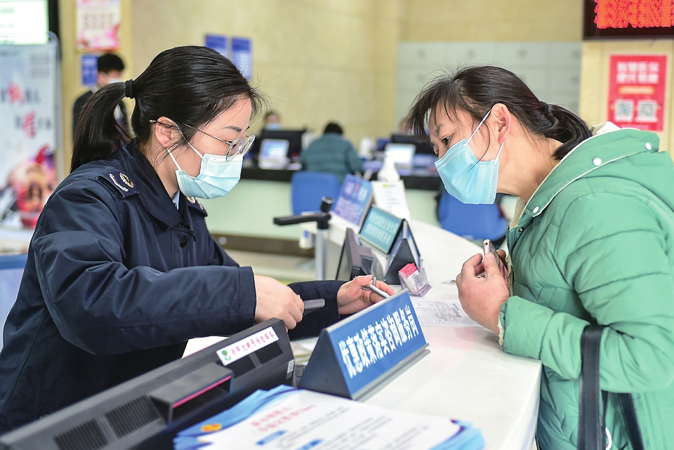 2021年2月5日,在福州经济技术开发区税务局办税服务厅,外来务工人员田道彩(右)在缴交个人基本养老保险费。新华社记者魏培全摄