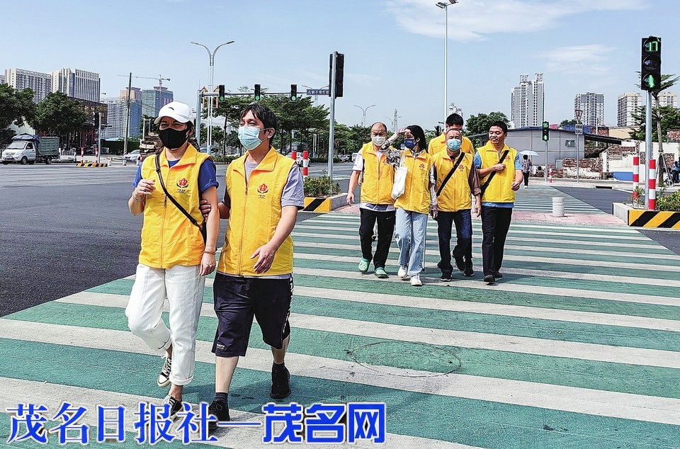 ▲盲人朋友在志愿者的引导下上街体验无障碍出行。 茂名日报社全媒体记者黄信涛 摄