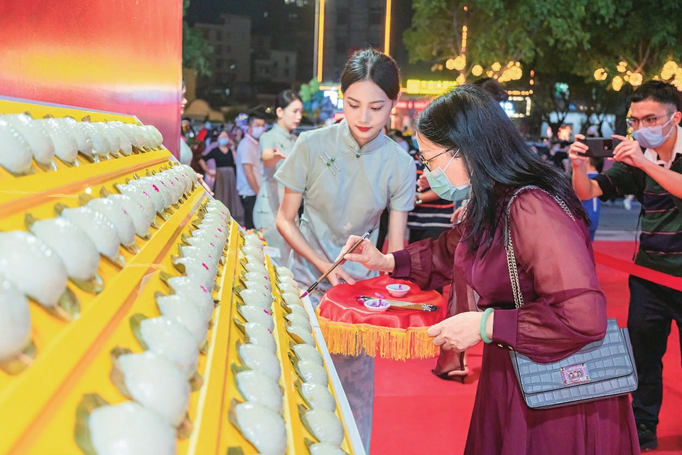 ▲游客在签到区给籺点上一个红点,寄意喜庆吉利。