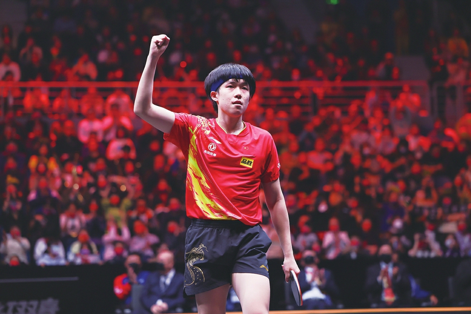 10月30日,王楚钦在比赛中庆祝得分。 当日,在河南新乡举行的WTT世界杯决赛男子单打决赛中,中国选手王楚钦以4比2战胜日本选手张本智和,夺得冠军。 新华社发(高志勇摄)