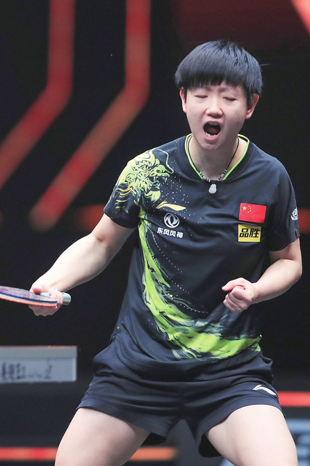 10月30日,孙颖莎在比赛中庆祝得分。 当日,在河南新乡举行的WTT世界杯决赛女子单打决赛中,中国选手孙颖莎以4比3战胜队友陈梦,夺得冠军。 新华社发(高志勇摄)