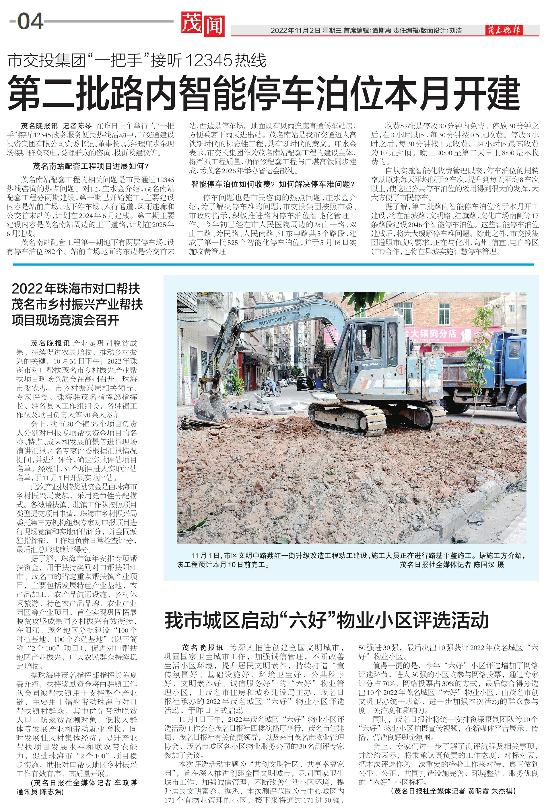 茂名南站配套工程的相关问题是市民通过12345热线咨询的热点问题。对此,庄水金介绍,茂名南站配套工程分两期建设,第一期已开始施工,主要建设内容是站前广场、地下停车场、人行通道、风雨连廊和公交首末站等,计划在2024年6月建成。第二期主要建设内容是茂名南站周边的主干道路,计划在2025年6月建成。