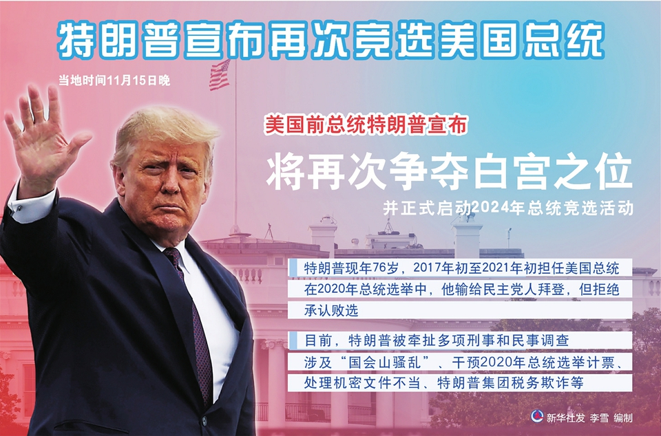 新华社华盛顿11月15日电(记者孙丁)美国前总统特朗普 15 日晚宣布将再次争夺白宫之位,并正式启动 2024 年总统竞选活动。