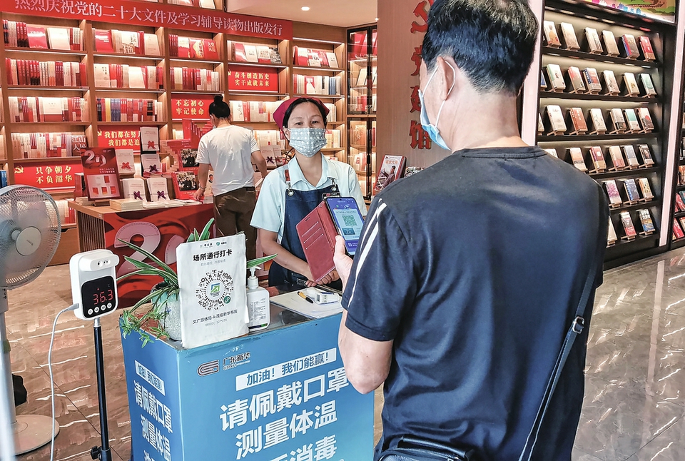 昨天,在市区新华书店,市民自觉佩戴口罩,用手机扫“场所码”进场。目前,我市各地进一步强化落实公共场所“场所码”扫码查验的防疫措施,亮健康码、戴口罩、测体温等防疫措施成为常态化工作。茂名日报社全媒体记者岑稳摄