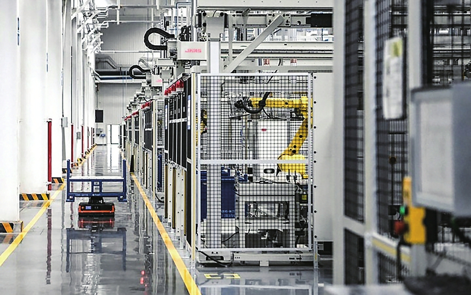 法士特西安高智新公司变速器零件数字化生产线,智慧物流小车在进行物品运输。新华社记者刘潇摄