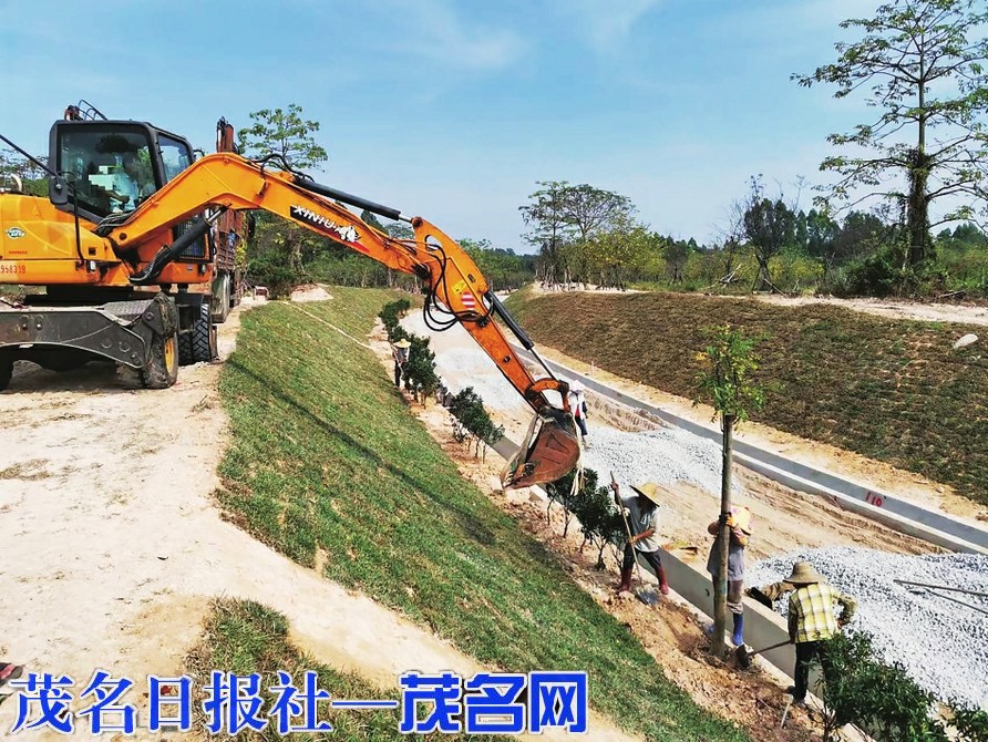 昨天,在茂名露天矿生态公园西南侧,工人正在新建的环湖路上种植绿化树和草坪,加快推进环湖路项目施工进度。茂名日报社全媒体记者岑稳摄