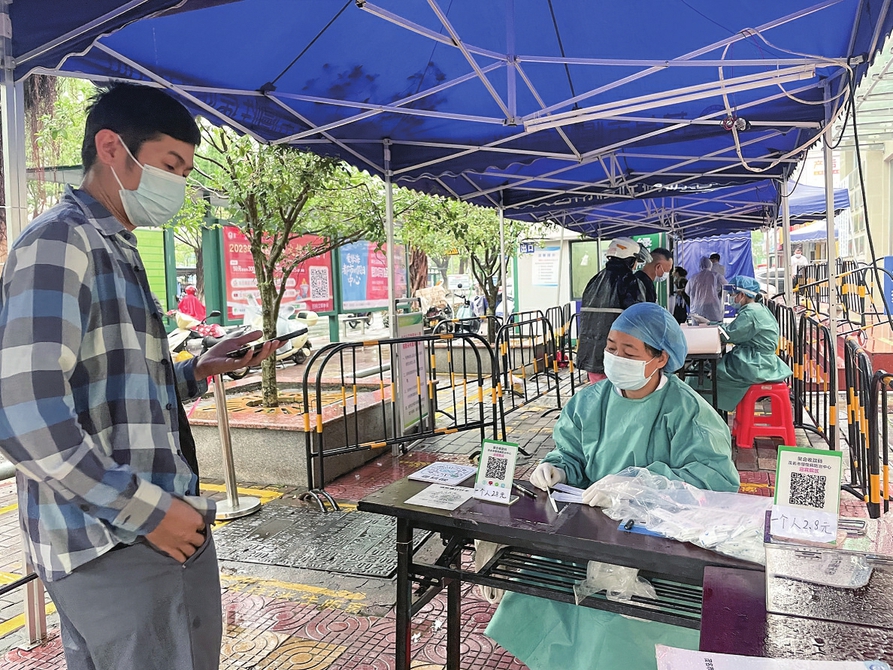 在茂名市慢性疾病防治中心核酸采样点,市民扫码支付单人单检费用。茂名晚报记者李君平 摄