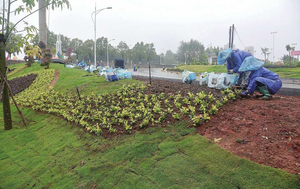 昨日,记者在市区站北七路社区体育公园北侧看到,园林工人正在冒雨栽植花草苗木,为市民营造了一个舒适、整洁、绿化、美化的居住环境。茂名日报社全媒体记者陈国汉摄