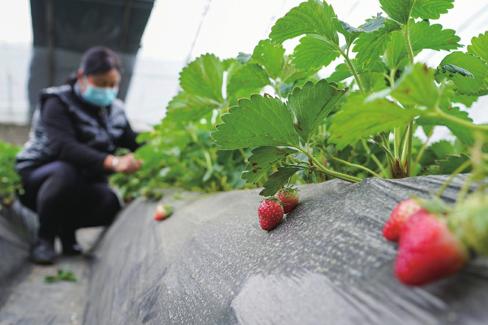 11月22日,河北省邢台市内丘县一家农业生态园的员工在管护草莓。