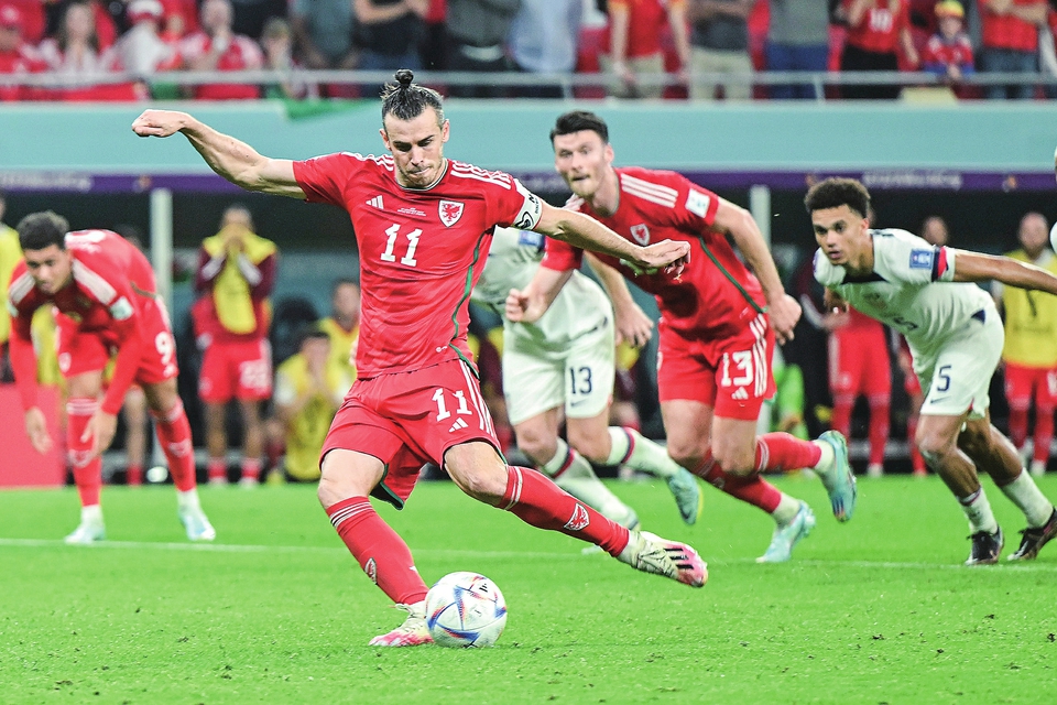 11月21日,威尔士队球员加雷斯·贝尔(前)在比赛中射入点球扳平比分。