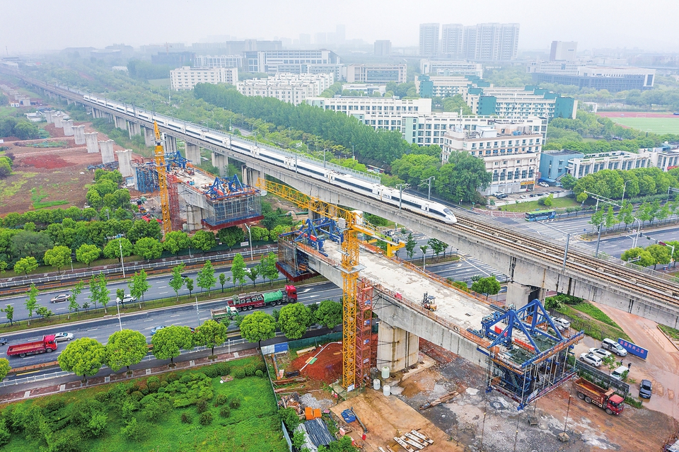 中铁四局四公司的工程人员在江苏南沿江城际铁路站前Ⅰ标工程跨天元东路连续梁施工点施工作业(2021年4月27日摄,无人机照片)。 新华社记者李博摄
