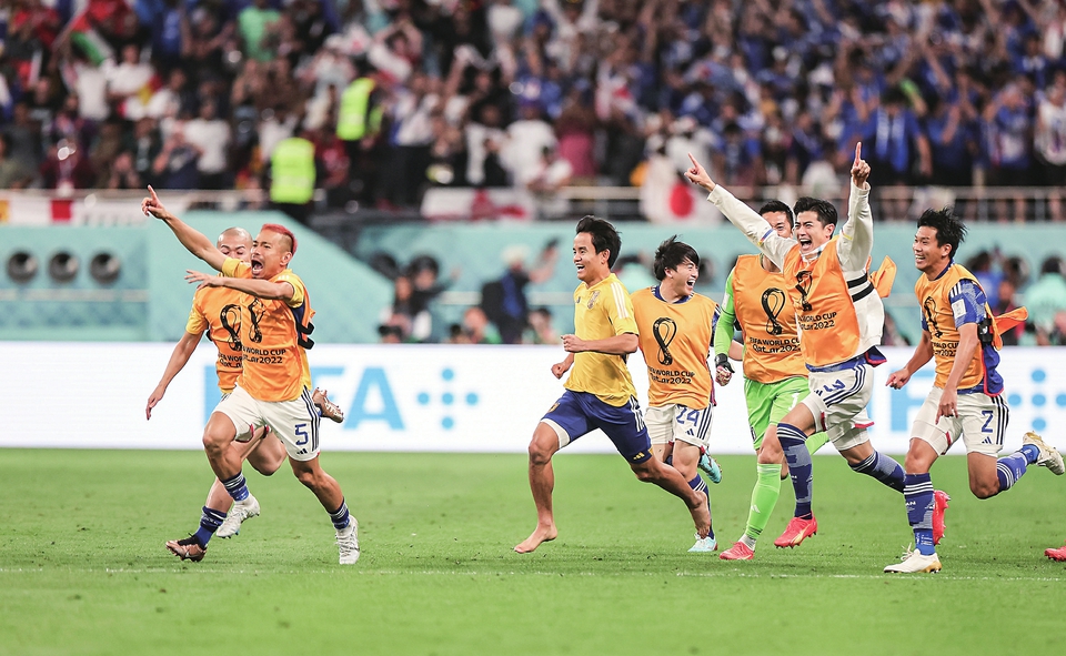当日,在卡塔尔多哈哈里发国际体育场进行的2022卡塔尔世界杯足球赛E组比赛中,日本队以2比1战胜德国队。新华社记者 曹灿 摄