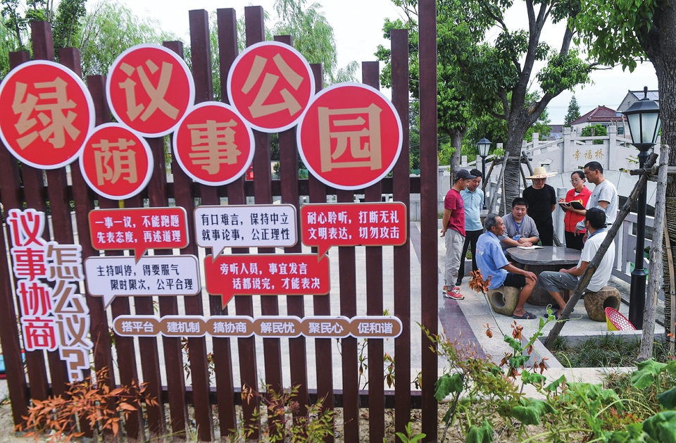 新华社记者在浙江省湖州市长兴县吕山乡龙溪村的议事公园内,田园议事会成员开展讨论协商(2022年7月21日摄)。新华社记者徐昱摄