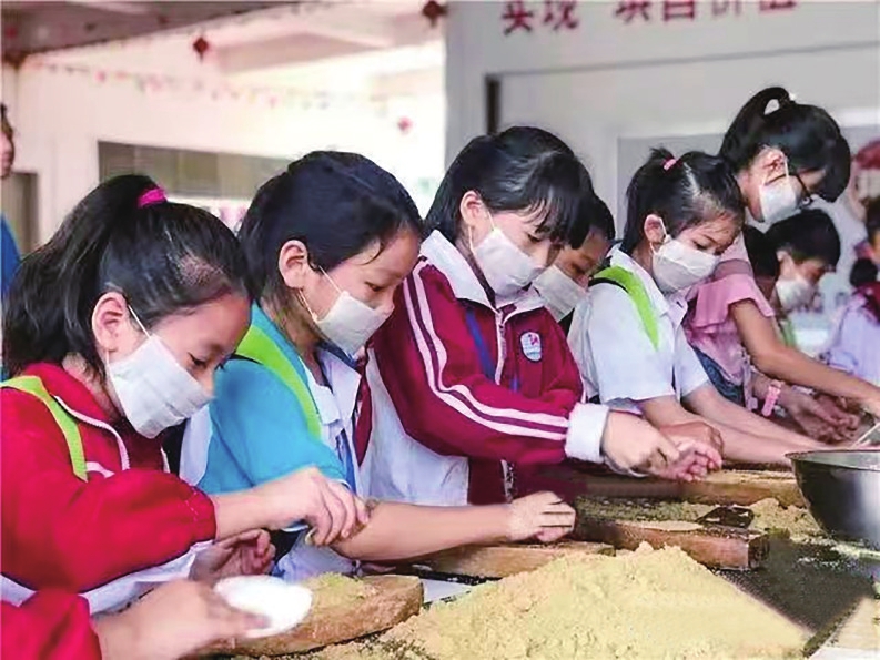 茂名日报社全媒体小记者在琪昌公司学习炒米饼的制作。