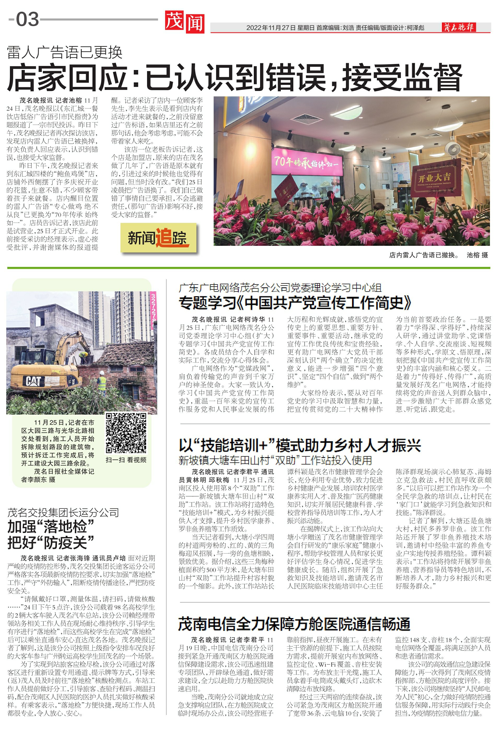 茂名晚报讯 记者李君平 11月19日晚,中国电信茂南分公司接到紧急开通茂南区方舱医院通信保障建设需求,该公司迅速组建专项团队,开辟绿色通道,做好需求建设,全力以赴助力方舱医院快速启用。