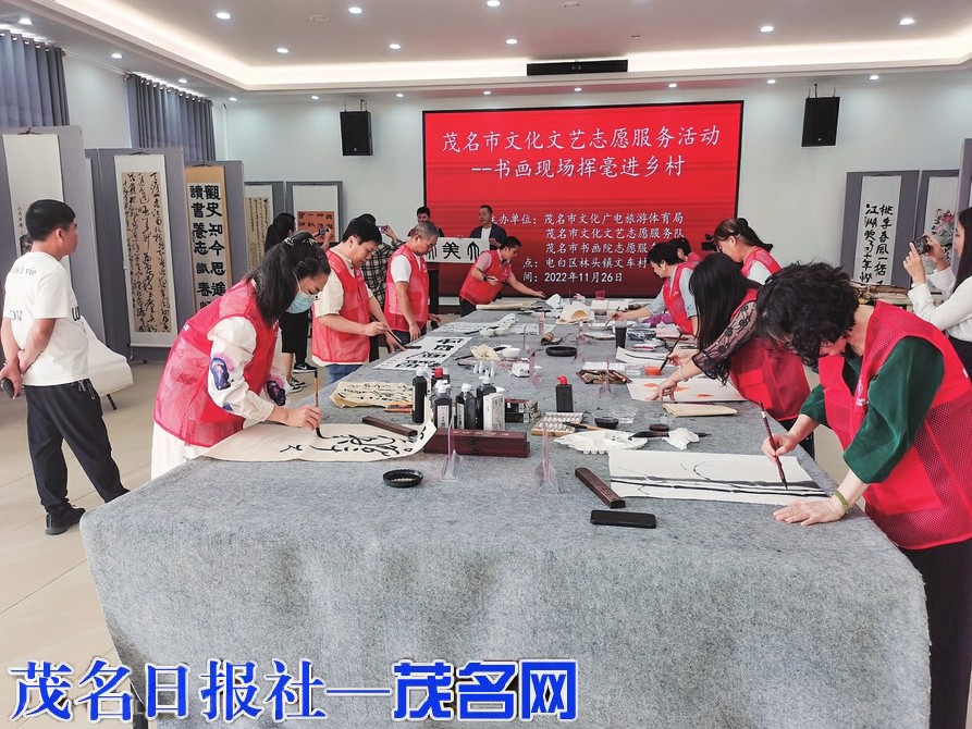 茂名晚报讯记者邓晖晖为切实做好文化惠民服务工作,让优秀传统文化扎根田间地头,昨日上午,由市文广旅体局、市文化文艺志愿服务队、市书画院志愿服务队主办的“茂名市文化文艺志愿服务活动——书画现场挥毫进乡村”走进电白区林头镇文车村。