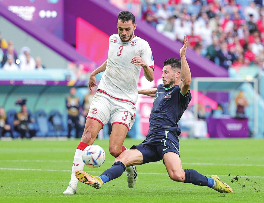 当日,在卡塔尔沃克拉贾努布球场进行的2022卡塔尔世界杯足球赛D组比赛中,突尼斯队对阵澳大利亚队。最终,澳大利亚队以1比0战胜突尼斯队。新华社记者王东震摄