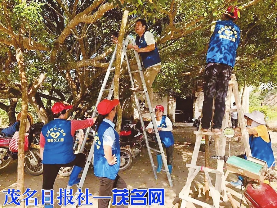 茂名晚报讯记者吴祖光通讯员化义协莫颖华近日,化州市义工协会那务义工团元山服务队义工来到那务镇元山小学旁边,对一棵出现安全隐患的古树进行修整养护,以有效保护古树顺利生长。