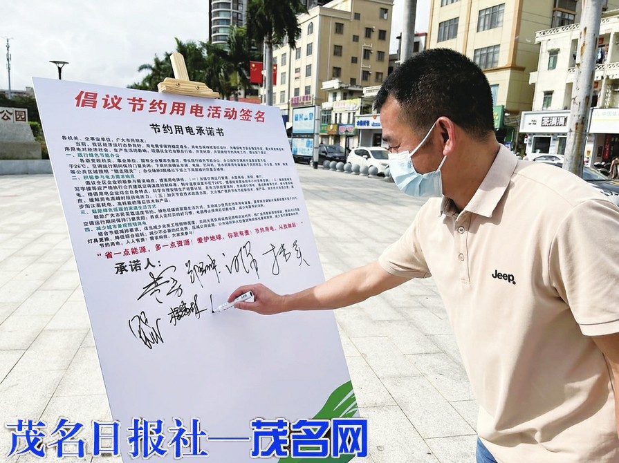 市民在节约用电承诺书上签名。 茂名晚报记者 张丁文摄