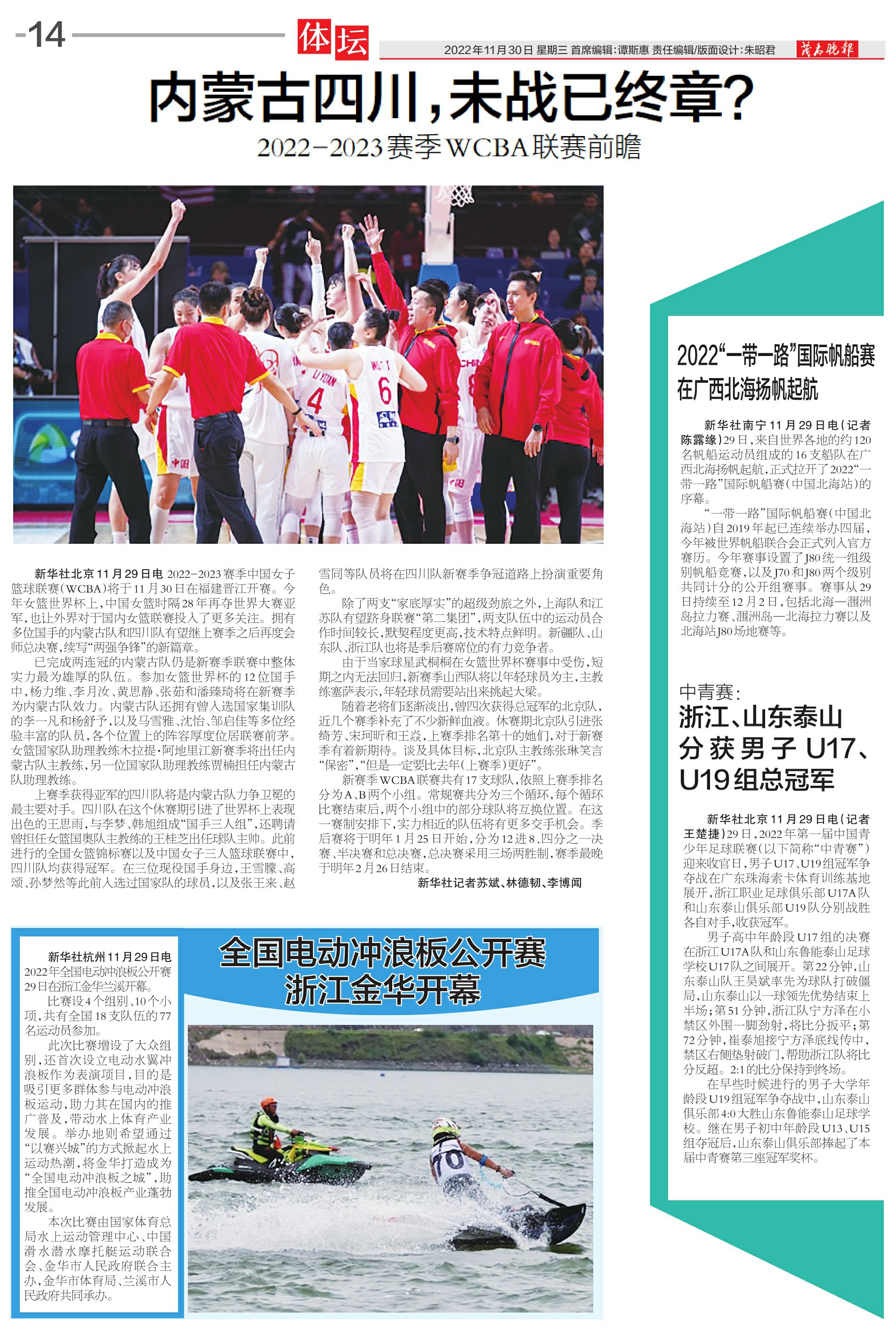 新华社北京11月29日电2022-2023赛季中国女子篮球联赛(WCBA)将于11月30日在福建晋江开赛。今年女篮世界杯上,中国女篮时隔28年再夺世界大赛亚军,也让外界对于国内女篮联赛投入了更多关注。拥有多位国手的内蒙古队和四川队有望继上赛季之后再度会师总决赛,续写“两强争锋”的新篇章。