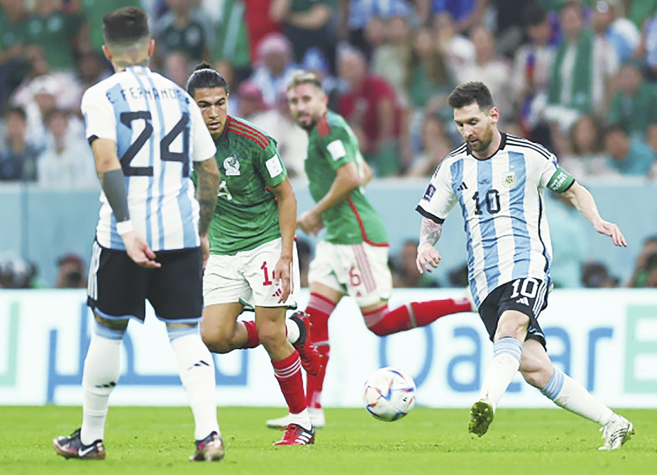 11月26日,阿根廷队以2比0战胜墨西哥队,图为阿根廷队球员梅西(右一)在比赛中传球。新华社记者潘昱龙摄