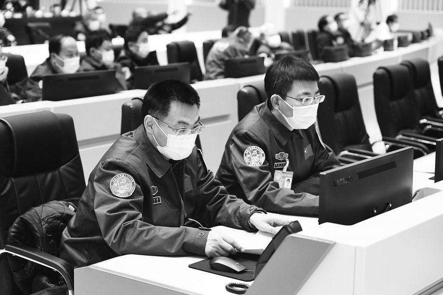 11月30日,酒泉卫星发射中心的航天科研人员在监测神舟十五号载人飞船与天和核心舱自主快速交会对接。 新华社发(葛利鑫摄)