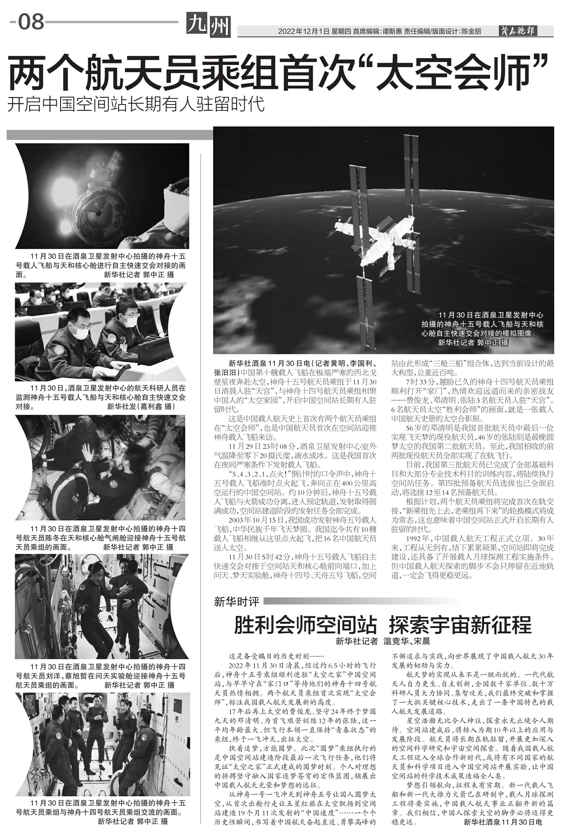 新华社酒泉11月30日电(记者黄明、李国利、张汨汨)中国第十艘载人飞船在极端严寒的西北戈壁星夜奔赴太空,神舟十五号航天员乘组于11月30日清晨入驻“天宫”,与神舟十四号航天员乘组相聚中国人的“太空家园”,开启中国空间站长期有人驻留时代。