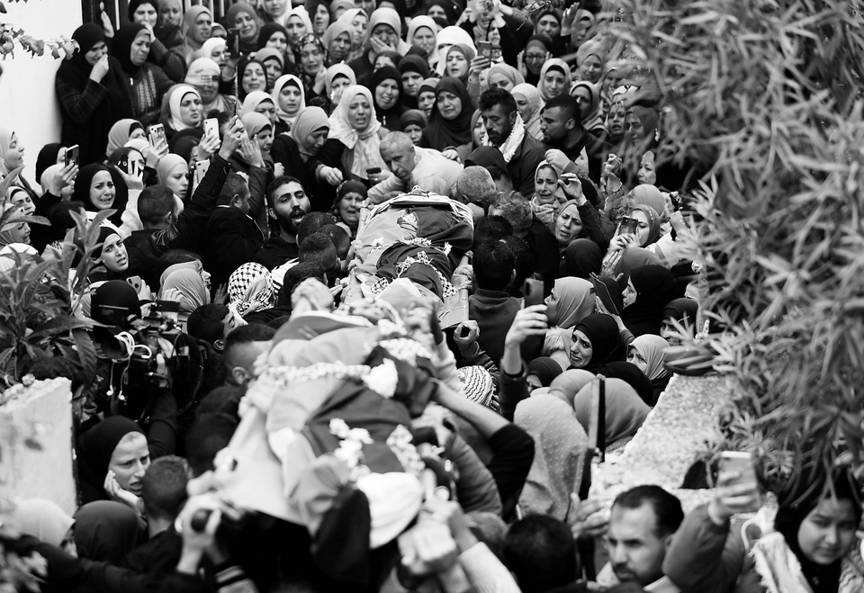 11月29日,在约旦河西岸城市拉姆安拉附近的拜特里马,人们为被以色列军队打死的巴勒斯坦人送葬。