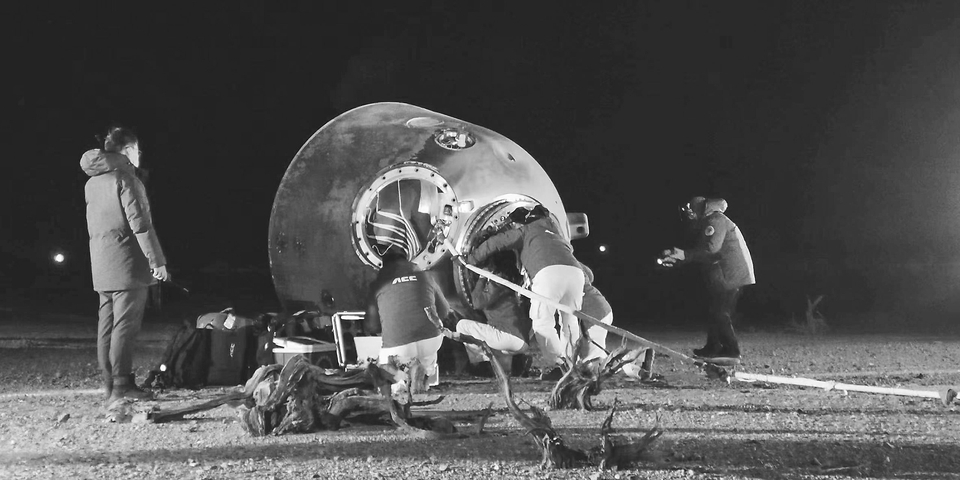 12月4日20时09分,神舟十四号载人飞船返回舱在东风着陆场成功着陆,现场医监医保人员确认航天员陈冬、刘洋、蔡旭哲身体状态良好,神舟十四号载人飞行任务取得圆满成功。新华社记者李刚摄
