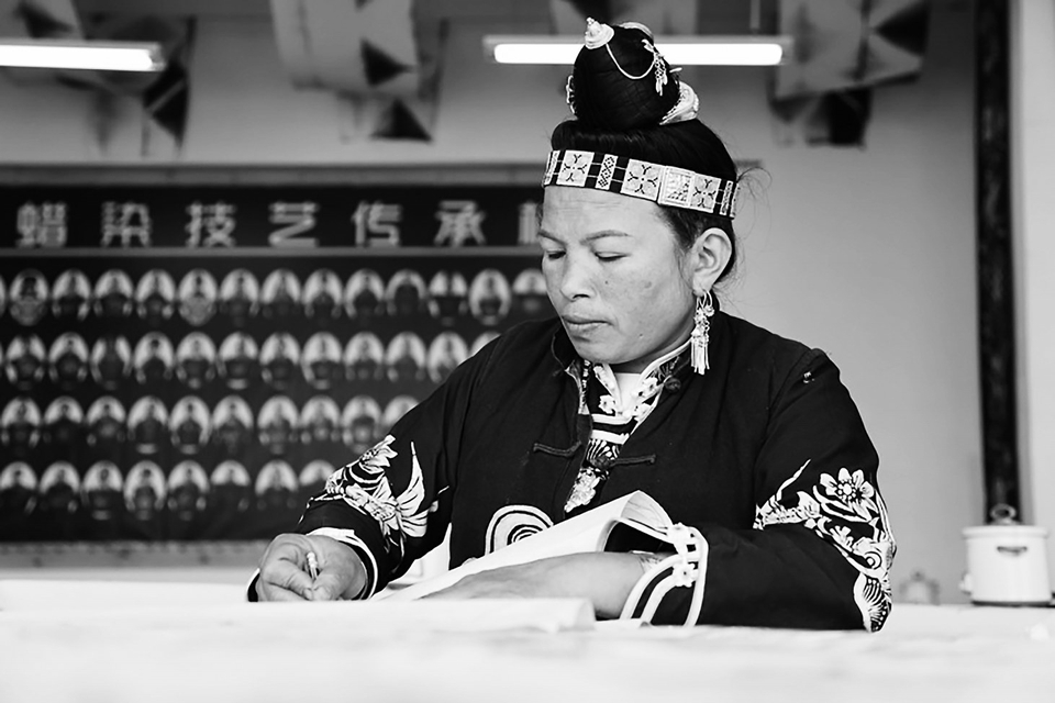 杨而报浪在蜡染工坊绘制纹样。新华社记者崔晓强摄
