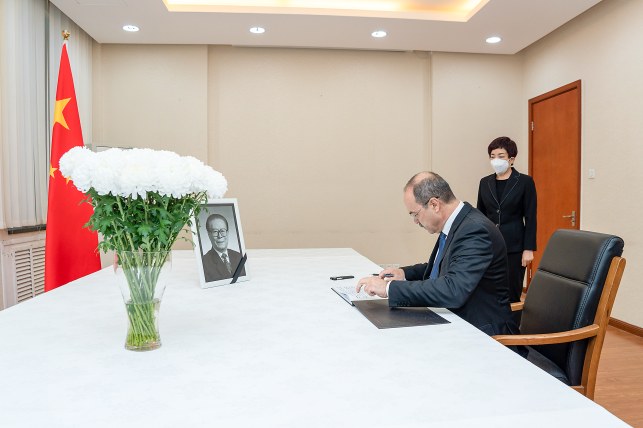 12月5日,乌兹别克斯坦总理阿里波夫在中国驻乌兹别克斯坦大使馆吊唁江泽民同志。 新华社发(高山摄)