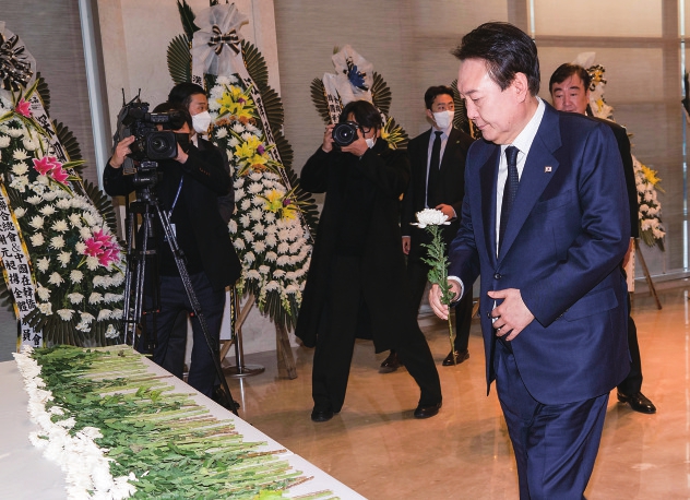 12月2日,韩国总统尹锡悦在中国驻韩国大使馆吊唁江泽民同志。 新华社发(李相浩摄)