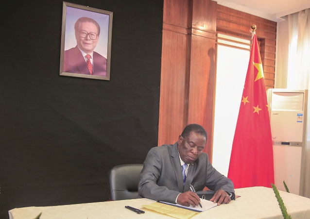 12月5日,津巴布韦总统姆南加古瓦在中国驻津巴布韦大使馆吊唁江泽民同志。 新华社发(肖恩·朱萨摄)