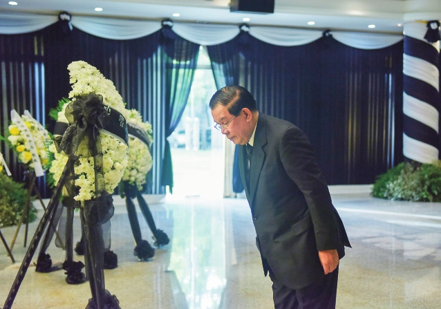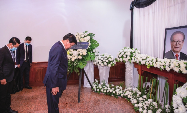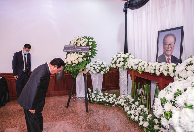 12月5日,柬埔寨首相洪森在中国驻柬埔寨大使馆吊唁江泽民同志。 新华社发(万坡摄)