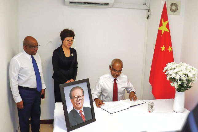 12月5日,马尔代夫总统萨利赫(右)在中国驻马尔代夫大使馆吊唁江泽民同志。 新华社发(中国驻马尔代夫大使馆供图)