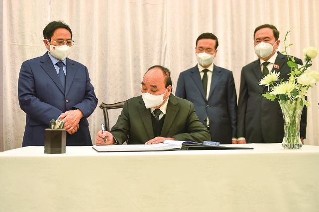 12月2日,越南国家主席阮春福(左二)、总理范明政(左一)等在中国驻越南大使馆吊唁江泽民同志。 新华社记者胡佳丽摄