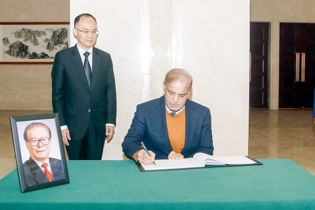 12月1日,巴基斯坦总理夏巴兹在中国驻巴基斯坦大使馆吊唁江泽民同志。 新华社发(艾哈迈德·卡迈勒摄)