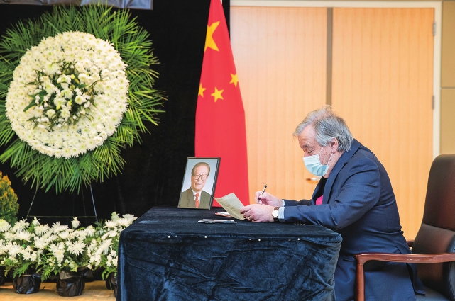 12月5日,联合国秘书长古特雷斯在中国常驻联合国代表团驻地吊唁江泽民同志。 新华社记者王迎摄