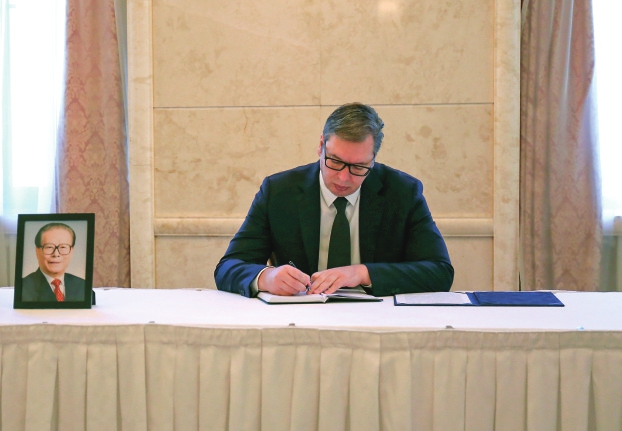 12月3日,塞尔维亚总统武契奇在中国驻塞尔维亚大使馆吊唁江泽民同志。 新华社发(中国驻塞尔维亚大使馆供图)